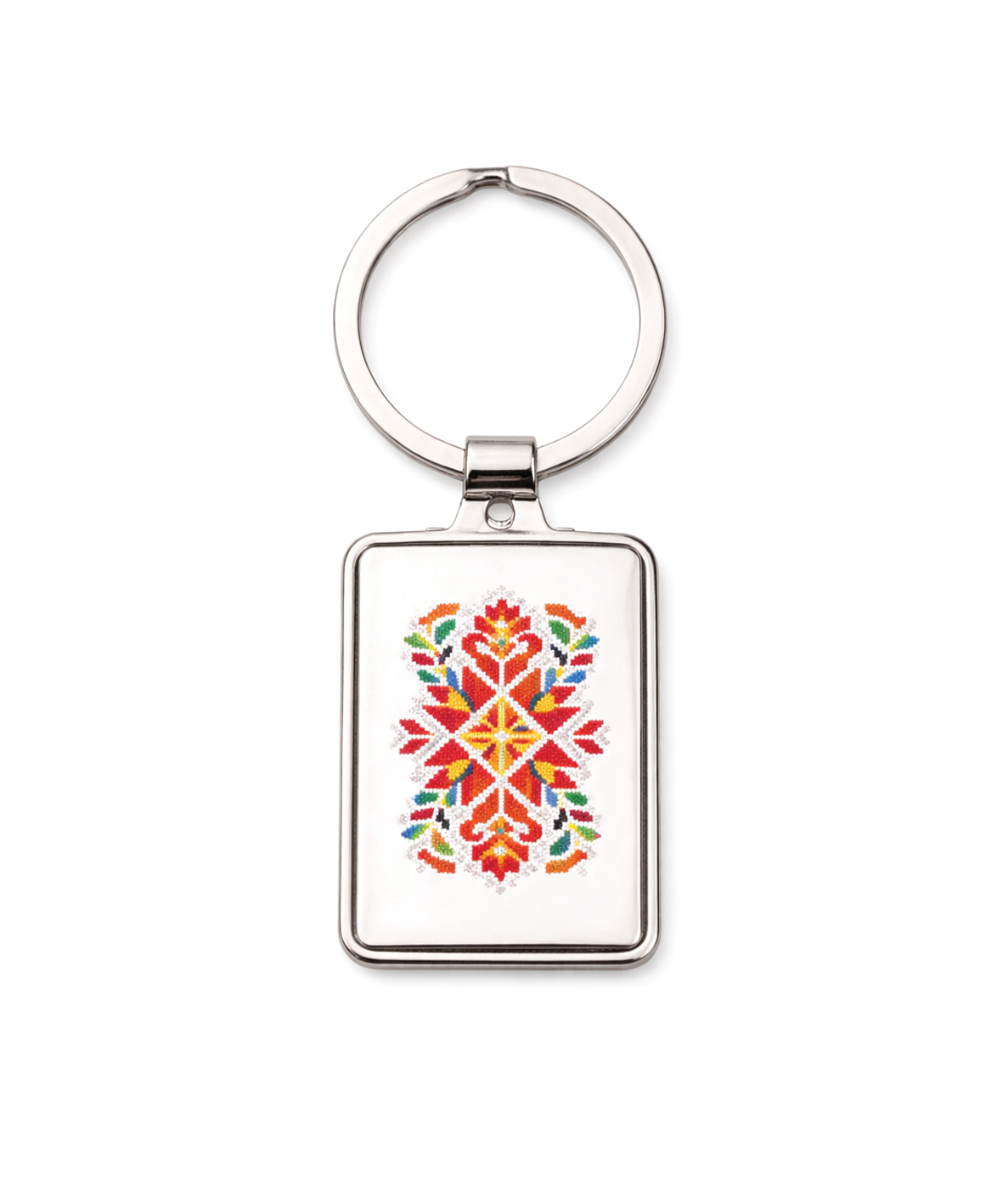 Луксозен метален ключодържател, украсен с ярки и детайлни мотиви от български шевици.