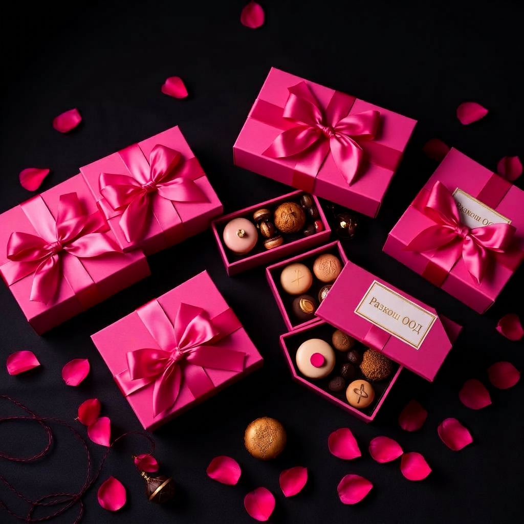 Комплект "Премиум" — 20 луксозни кутии с персонализиран етикет "Разкош ООД", всяка съдържаща изискана селекция от премиум десерти: ръчно изработени макарони, шоколадови трюфели, мини торти и други. Перфектният избор за специални корпоративни поводи и VIP клиенти.