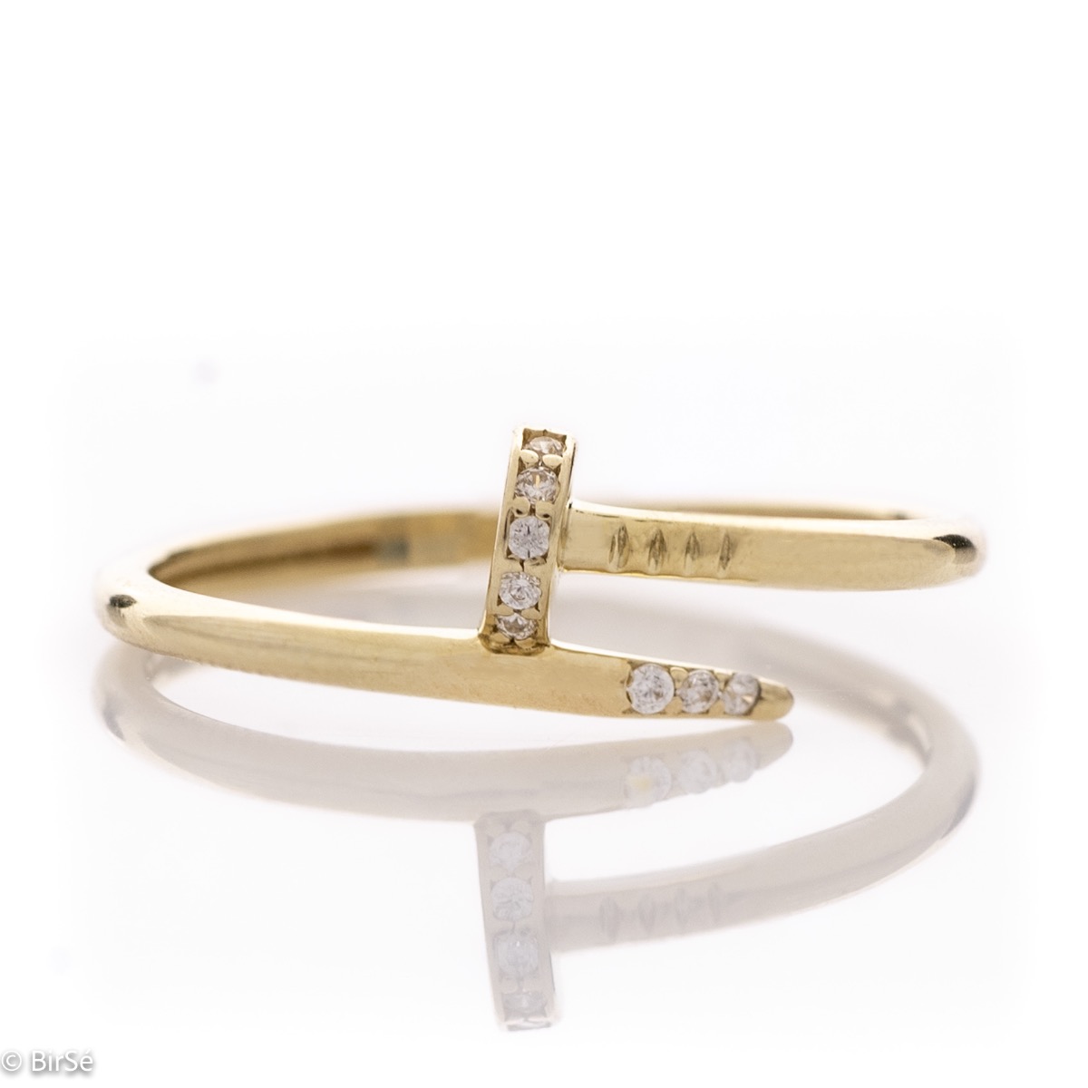 Фино дамско пръстенче с очарователен дизайн и форма на малко пиронче. Прецизна изработка изцяло от жълто злато и бляскави циркони.