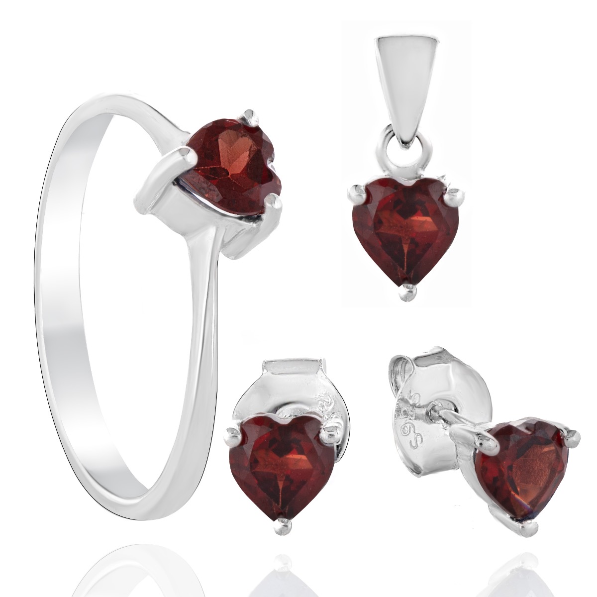 Елегантен комплект, украсен със сърца от гранат. Комплектът включва пръстен, висулка и обеци, изработени с прецизна сребърна изработка.
